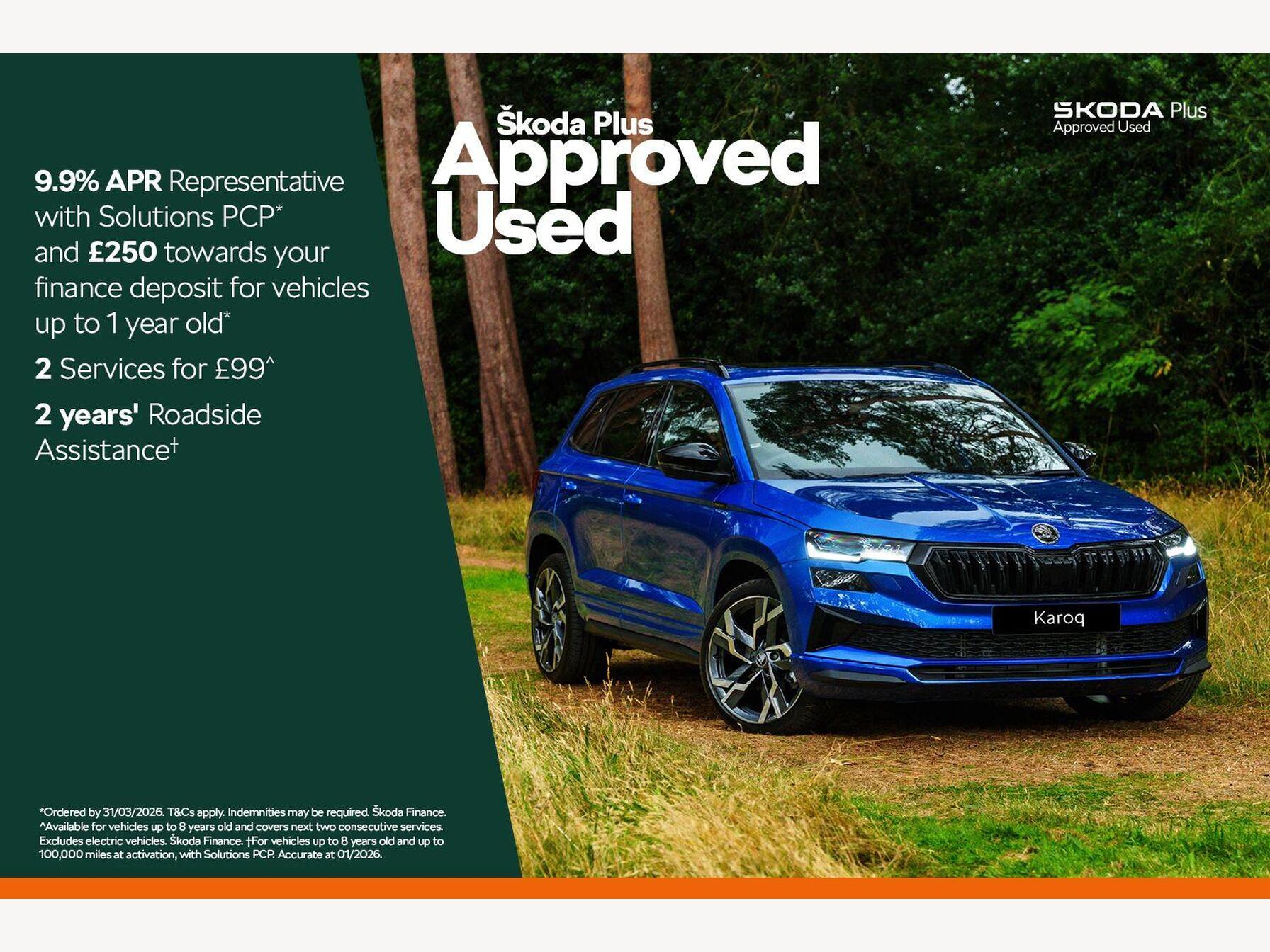 - All our used cars benefit from 12 months’ ŠKODA Roadside Assistance. If your car breaks down, one phone call will get you back on the move. Cover operates 24 hours a day, 365 days a year. Terms and conditions apply.